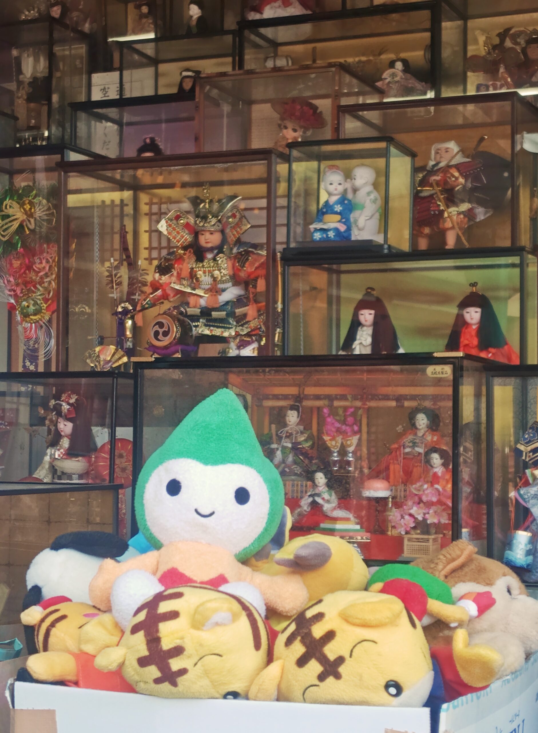 境内に並ぶひな人形やぬいぐるみ。