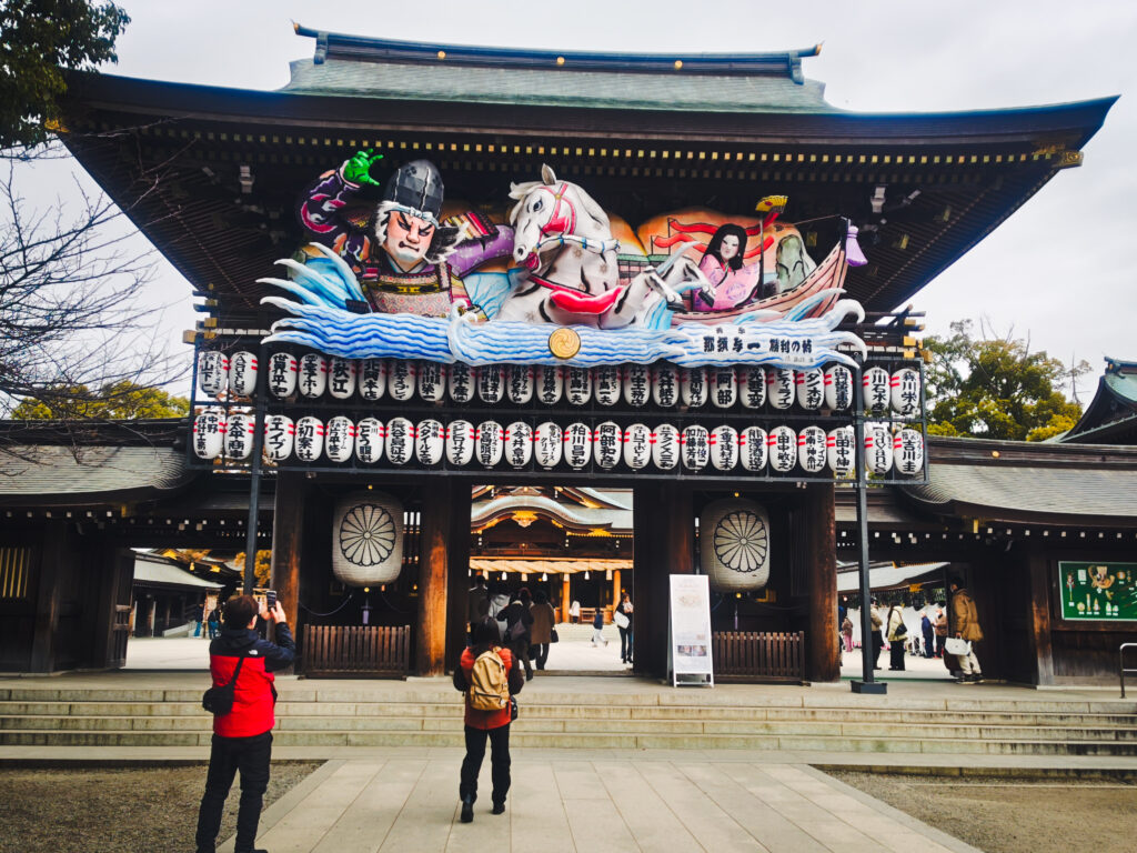 参拝時にはこの神門前の迎春ねぶたにカメラのレンズを向けたくなる撮影スポットだ。